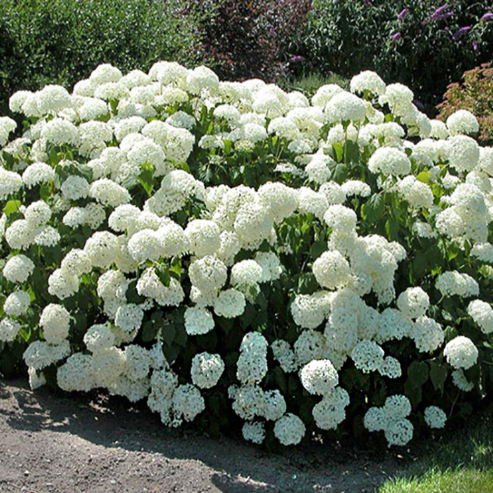 Особенности растения: Цветет с июня по сентябрь; крупные белые цветы собраны в шаровидные соцветия диаметром до 30 см, которые со временем могут становиться зелеными или розоватыми. Листья крупные, овальные, темно-зеленые, создающие контраст с белыми соцветиями. Высота растения может достигать 1-1,5 м, ширина около 1-2 м, что делает его универсальным для различных ландшафтных решений.