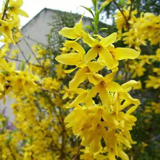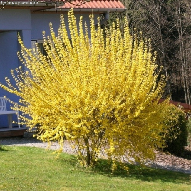 Особенности растения: цветет ранней весной, требует обрезки после цветения для поддержания формы. Цветы ярко-желтые, появляются до распускания листьев, создавая эффект солнечного облака. Листва зеленая, с ярким оттенком в летний период.