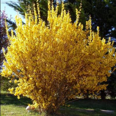 Особенности растения: цветет ранней весной, требует обрезки после цветения для поддержания формы и густоты. Цветы ярко-желтые, появляются до распускания листьев, создавая эффект солнечного облака. Листва зеленая, с насыщенным оттенком в летний период.