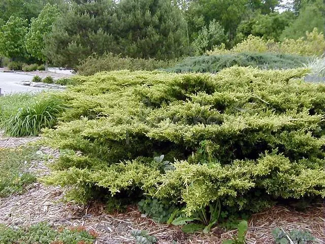 Особенности растения: стелющийся, раскидистый кустарник с плотной золотистой хвоей, которая летом яркая и золотистая, зимой приобретает легкий бронзовый оттенок. Растёт умеренно быстро, образует густой ковёр, хорошо переносит засуху и морозы, устойчив к болезням и вредителям. Требует регулярного полива в первые годы после посадки и защиты от сильных морозов в молодом возрасте. Пригоден для создания декоративных композиций и ландшафтного озеленения.