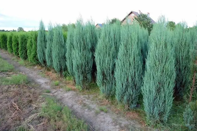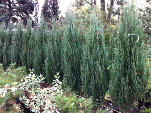 Можжевельник скальный ‘Блю Эрроу’ — узкий, колонновидный кустарник с серо-голубой хвоей, высотой до 5 м, диаметром до 1,2 м. Медленнорастущий, морозостойкий, неприхотлив, подходит для ландшафтного дизайна и живых изгородей